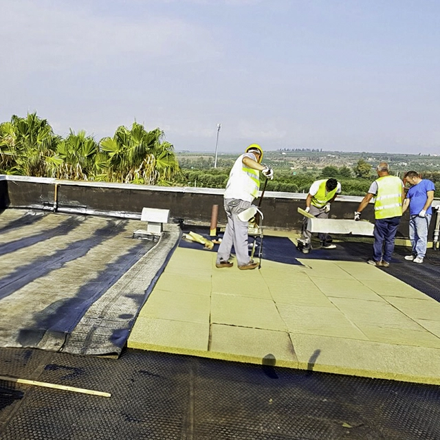 Ideal adhesive for horizontal positions, on surfaces with a slope not exceeding 45° and vertical joints, between 40 and 50 cm high, of bituminous membranes and insulating panels, in cases where torch welding or solvent-base adhesives cannot be used.